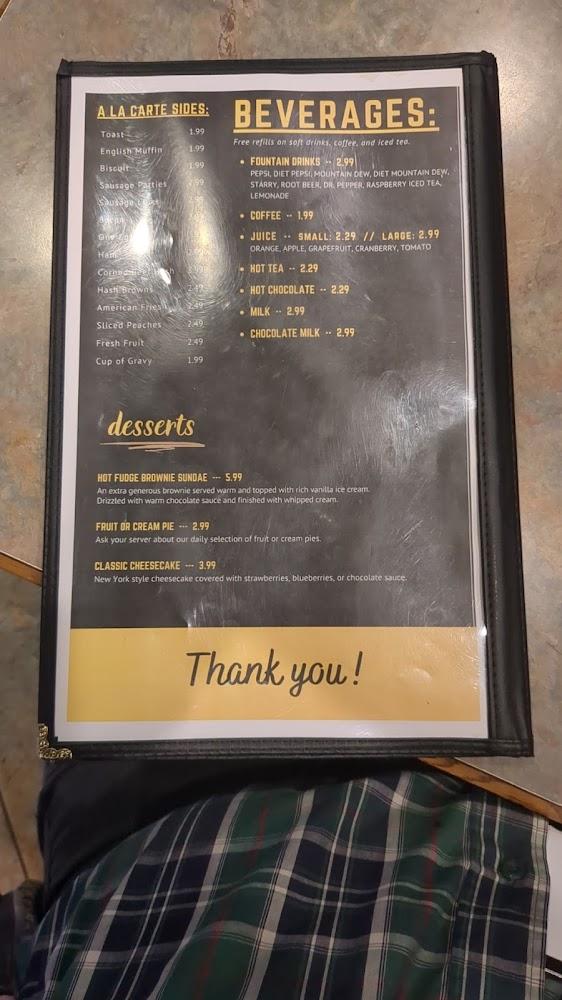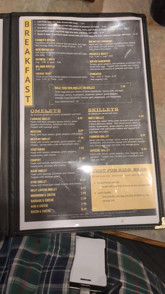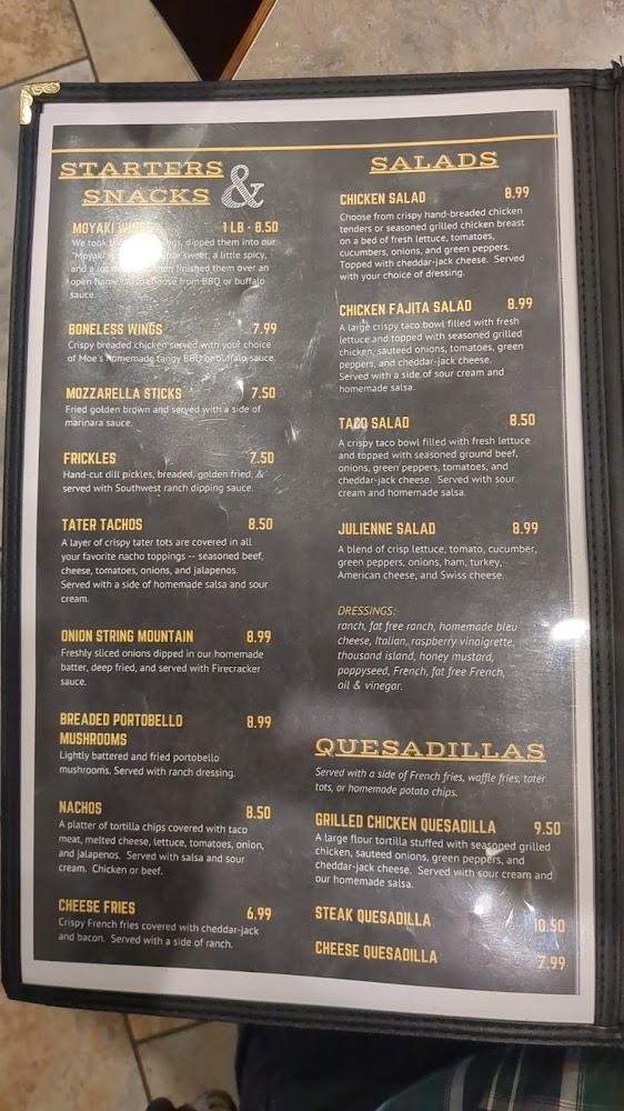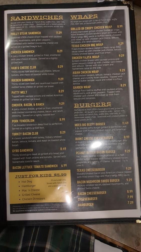 The menu at Moe's is extensive, catering to various tastes. Breakfast stands out, featuring omelets, skillets, and more, with prices around $7 to $9. Lunch and dinner options are equally impressive, offering sandwiches, burgers, and hearty plates like ribeye steak and baked spaghetti.